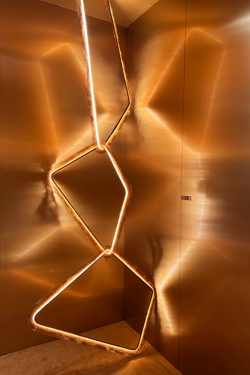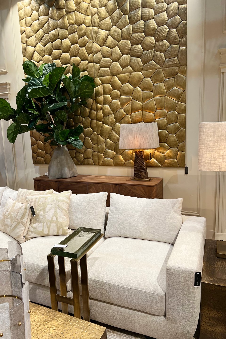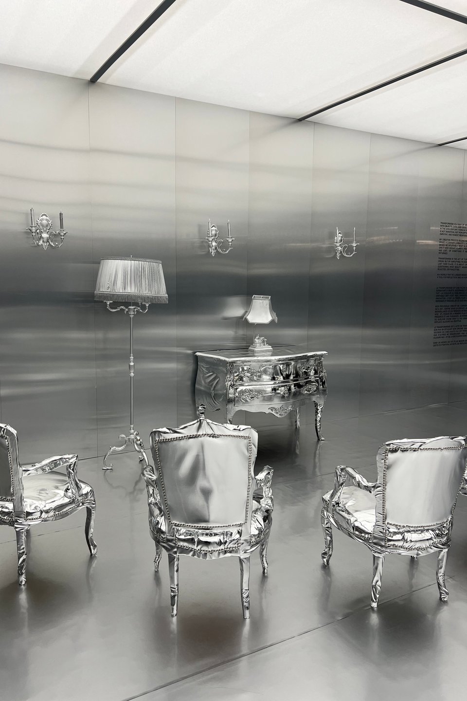 Золото, латунь или серебро — не цвет, но необходимый элемент палитры. Теплые и холодные металлы используются осознанно. Золото и латунь — намек на наследие, ремесло, классику. Серебро и хром — отсылка к футуризму, технологиям, концептуальным проектам вроде «Transformism». Их сочетание в одном пространстве — буквальная визуализация диалога эпох.