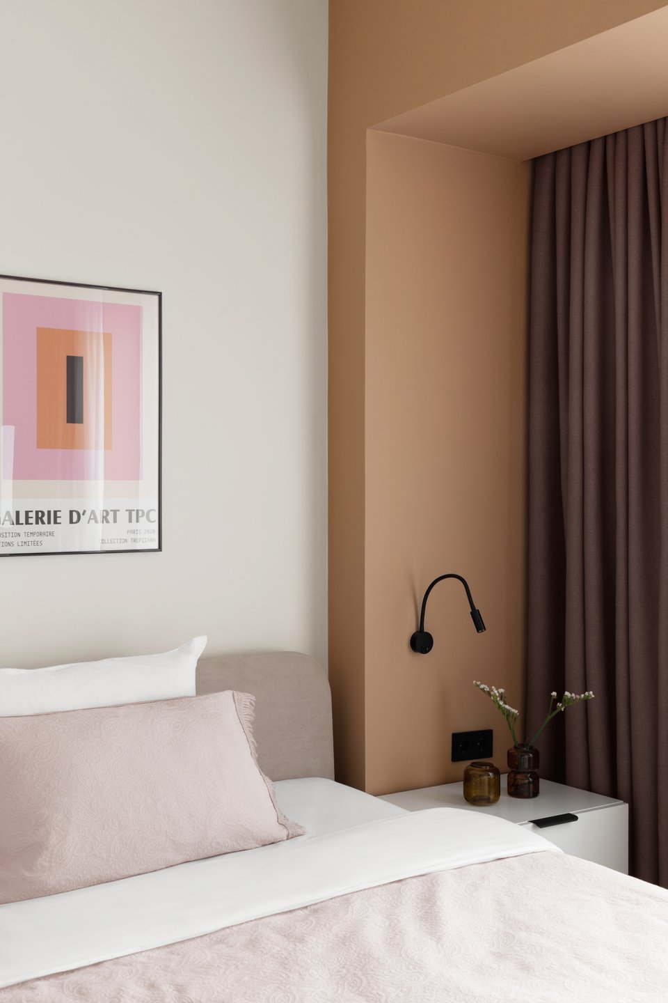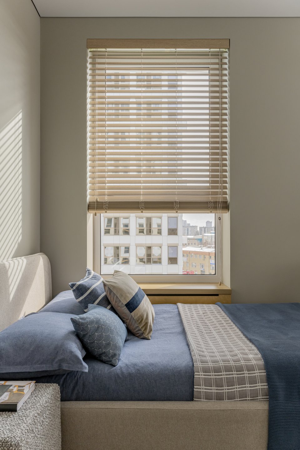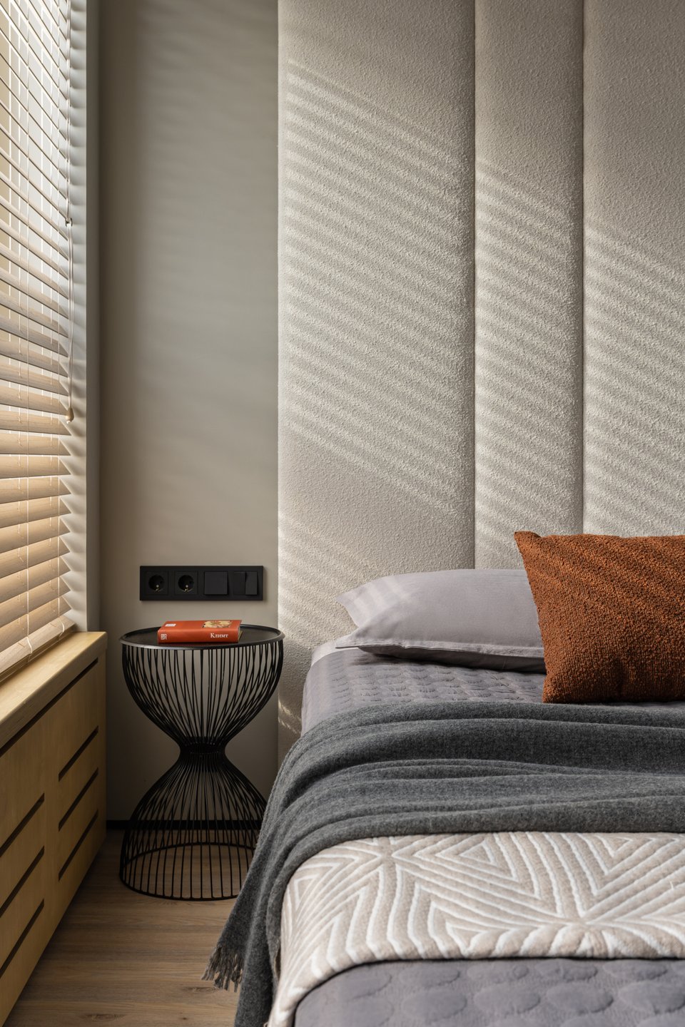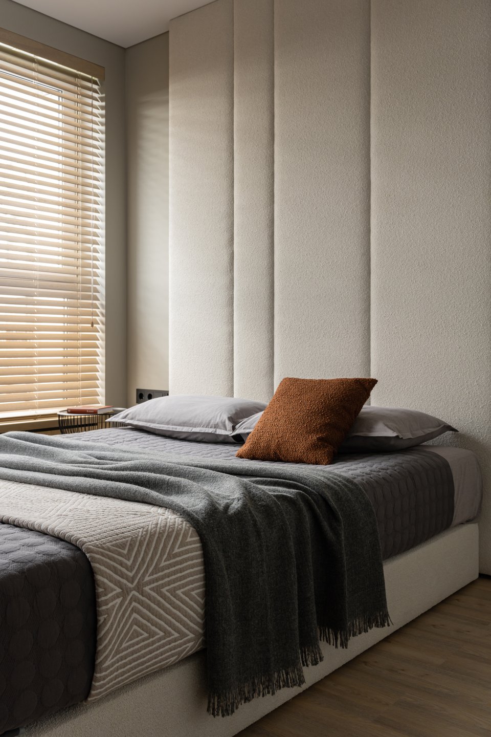 Для оформления спальни выбирайте фактуры, которые дарят комфорт: мягкие ткани, уютные пледы, бархатные подушки. На фото: трешка 60 кв.м, ЖК «Проспект Мира». Рум-тур, героиня и дизайнер: Ольга Люст; стилист: Екатерина Чуганова; фотограф: Наталья Горбунова