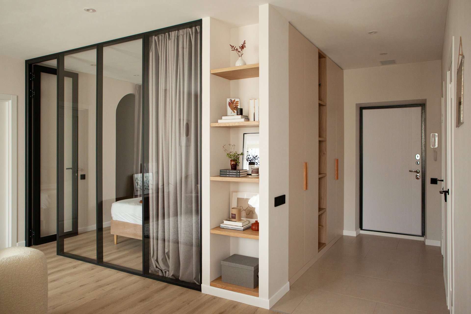 Чтобы обувь не портила общий вид, предусмотрите для нее место в шкафу или удобную обувницу. На фото: двушка 64 кв.м, ЖК «Дас Хаус». Дизайнер и декоратор: Алена Галкина; автор идеи и инвестор: Андрей Галкин; фото из личного архива дизайнера