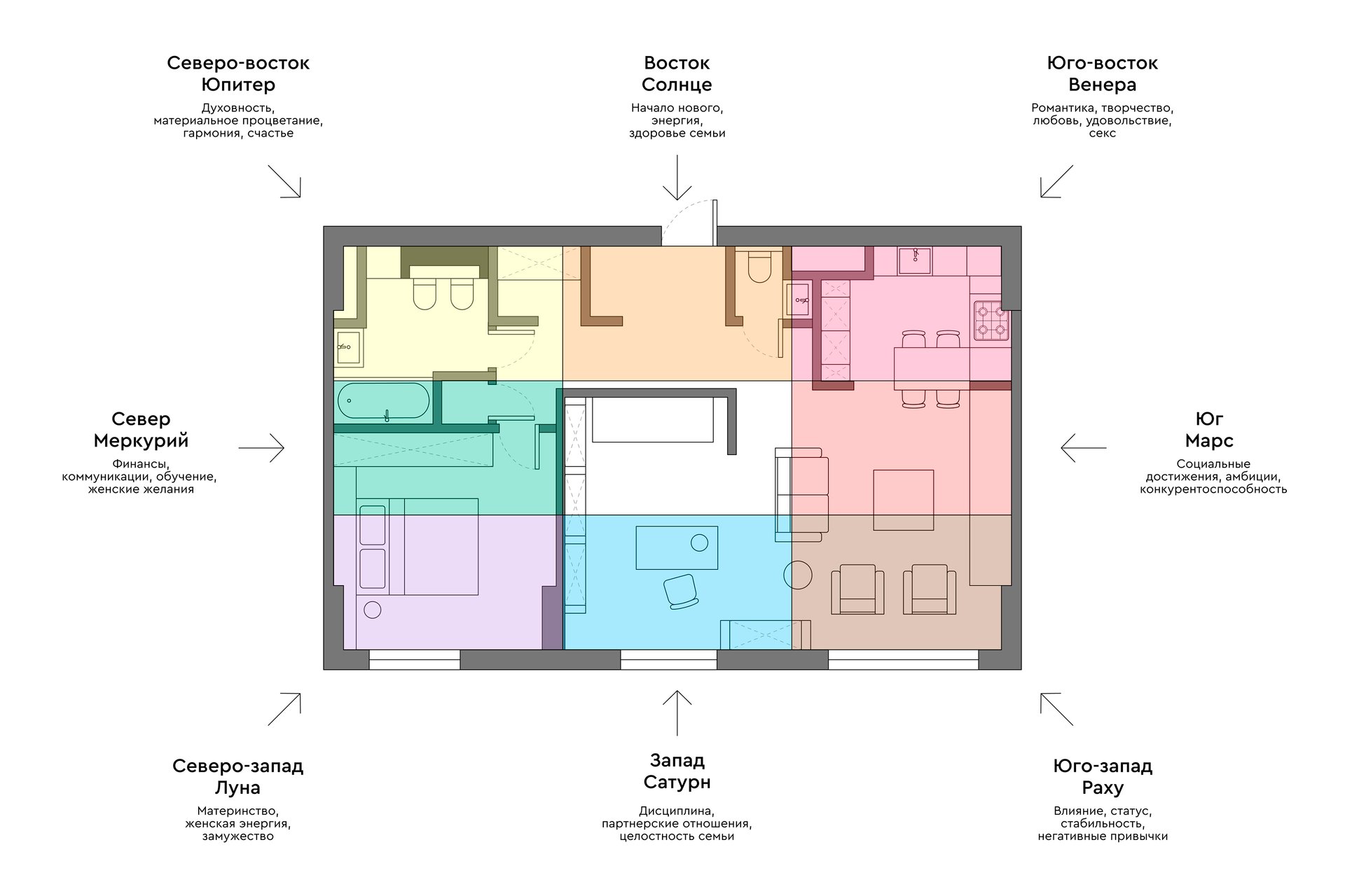 Согласно васту, дом — это больше, чем просто место, где мы живем. Это система, которая оказывает влияние на наши отношения, здоровье и общее настроение. Любую квартиру или коттедж можно условно разделить на девять зон по сторонам света. Каждая из них отвечает за разные аспекты. Например, восточная связана со здоровьем, западная — с отношениями, северная — с деньгами, а южная — с карьерой и целями. Если какая-то не в порядке, это может плохо сказаться на соответствующей сфере жизни.