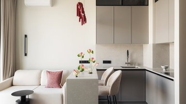 Особо хочется отметить то, как дизайнеры смогли на такой маленькой площади уместить все необходимое. Поражают изогнутые формы и обилие камня и дерева в интерьере. Также благодаря панорамным окнам все пространство заполнено светом, отчего оно еще больше расширяется.
