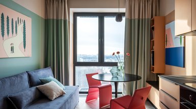 - На фото 3: квартира 23 кв.м в г. Москве. Дизайнер: Анастасия Заркуа; стилист: Ольга Олейникова; фотограф: Роман Алексеев
