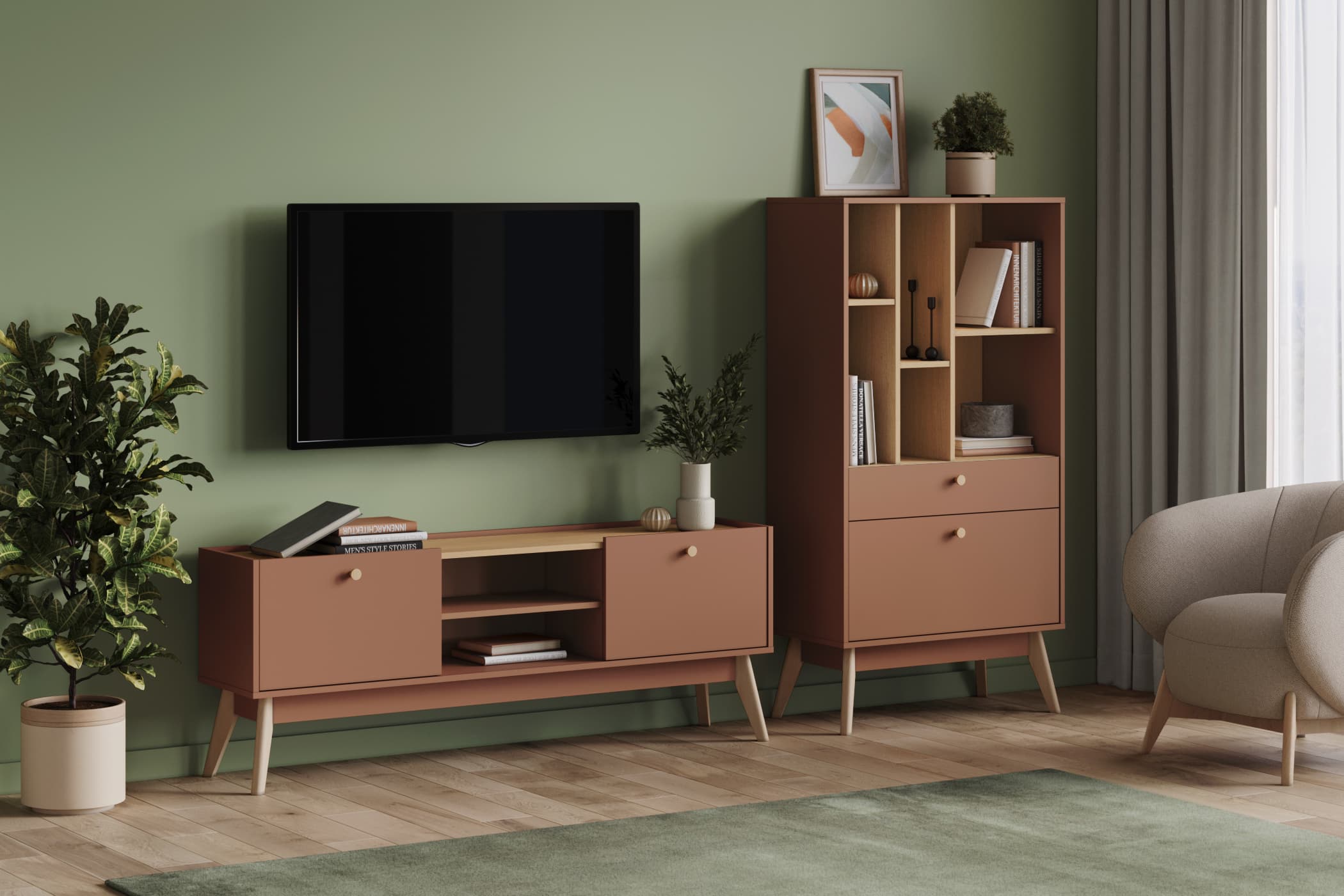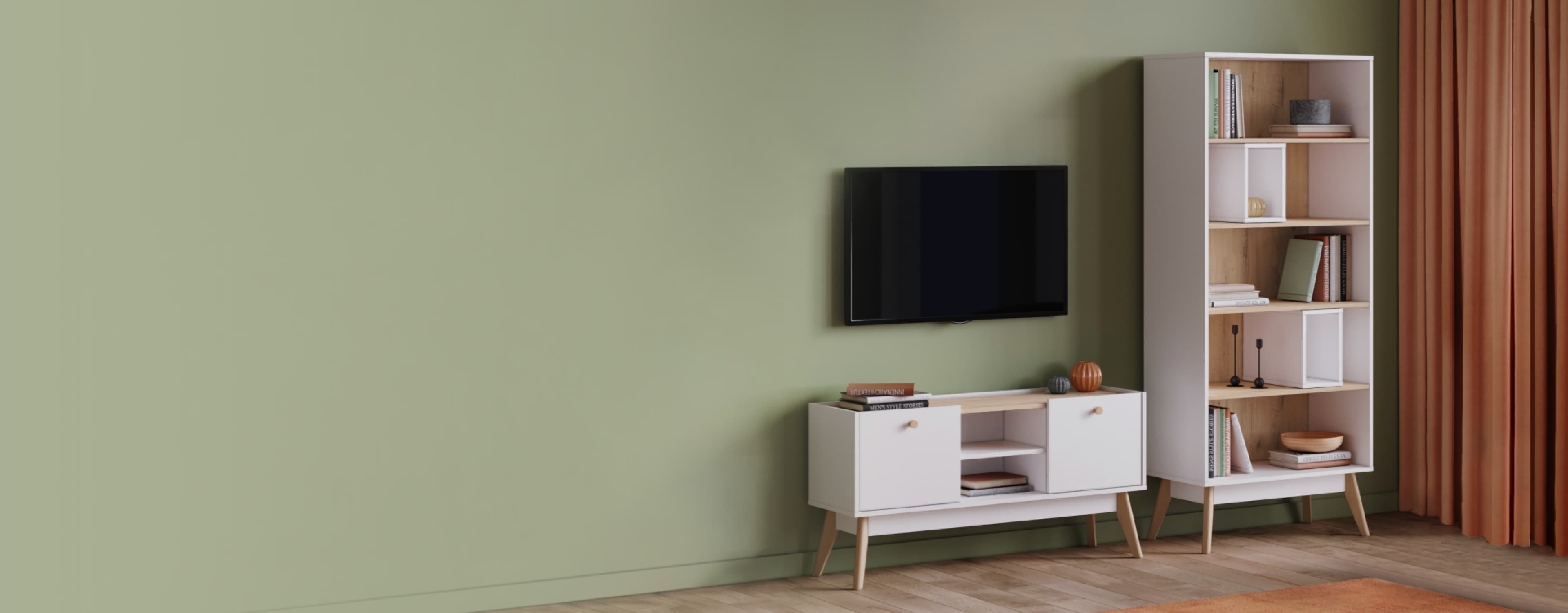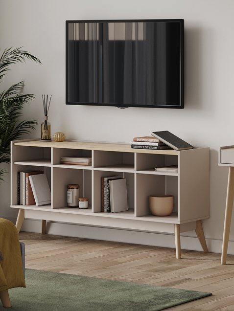 Практичные ТВ-тумбы с откидными фасадами экономят место и незаменимы для аккуратных гостиных. На поверхности большинства комодов есть бортики, которые создают дополнительное место для хранения мелочей.