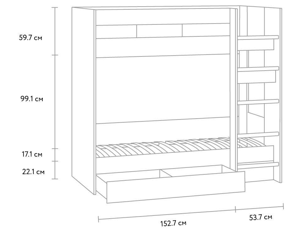 Основание кровати: нижний ярус - реечное деревянное, верхний ярус - ЛДСП