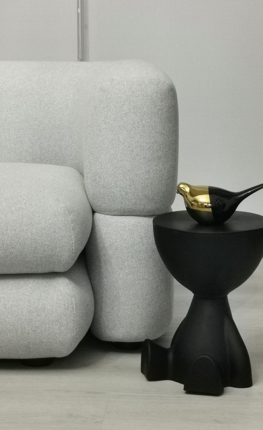 Уникальный дизайн, разработанный Димой Логиновым, сочетает плавные формы и тактильно приятные фактуры. За счет плотной велюровой ткани создается меланжевый эффект и спокойный матовый блеск, который подчеркивает округлые линии мебели.