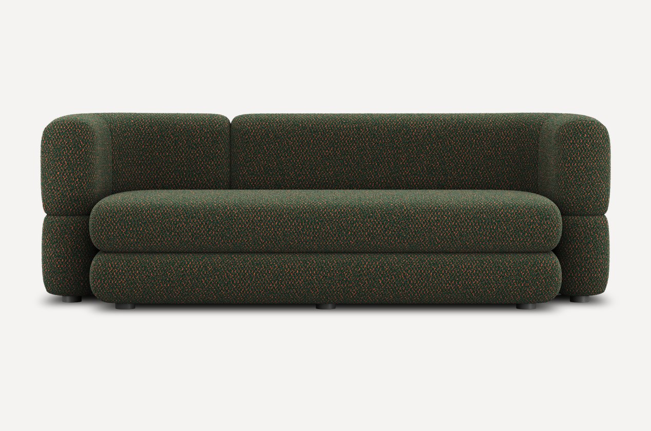 Уникальный дизайн, разработанный Димой Логиновым, сочетает плавные формы и тактильно приятные фактуры. За счет плотной велюровой ткани создается меланжевый эффект и спокойный матовый блеск, который подчеркивает округлые линии мебели.