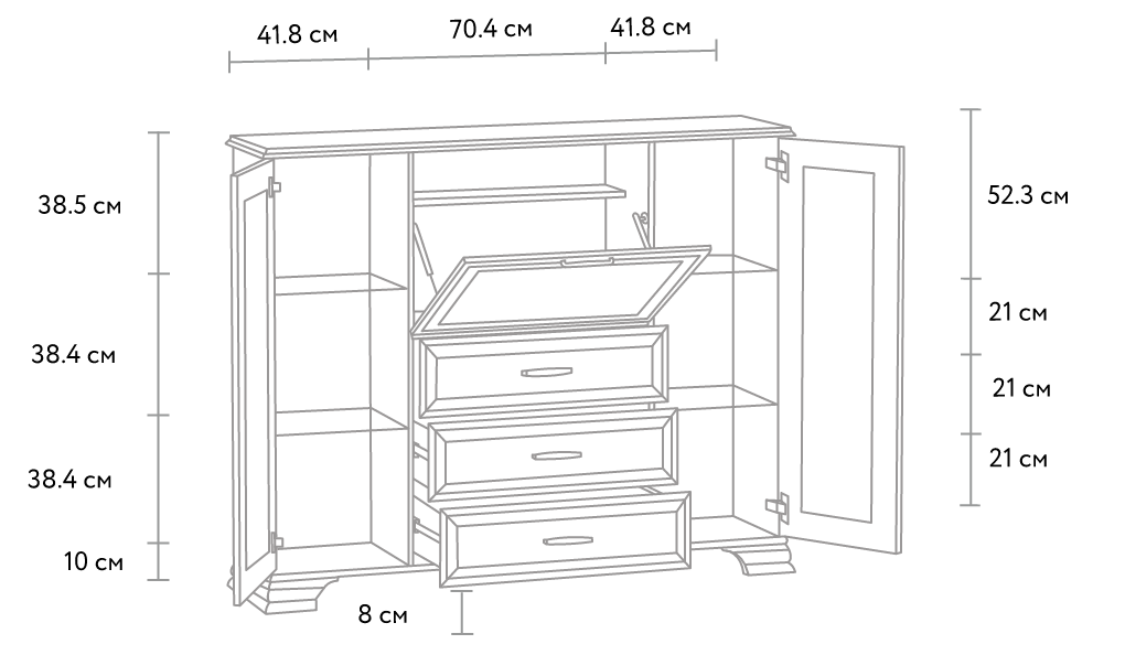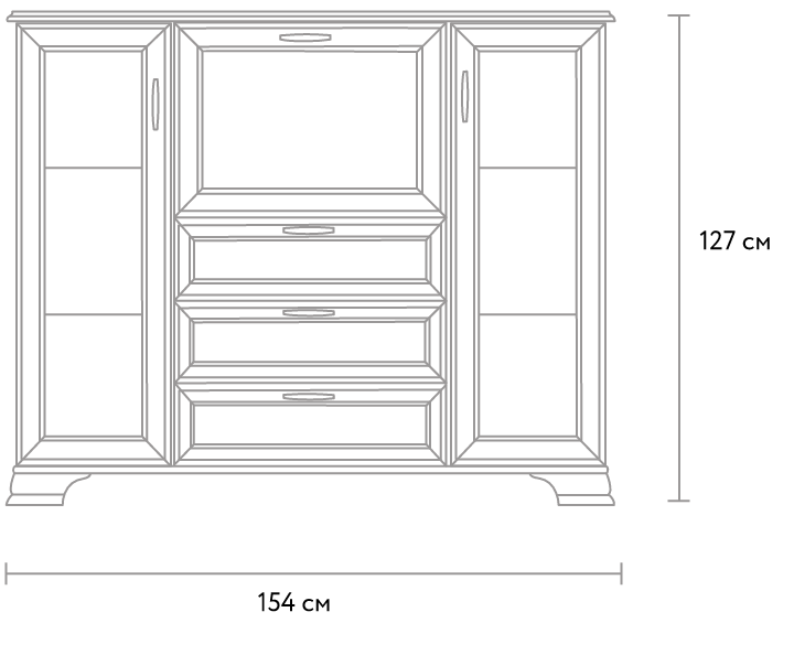 Вместительный комод «Тиффани» − отличное решение для классической гостиной. В отличие от большинства моделей, в его отделке сочетаются глухие и стеклянные фасады. Модель легко комбинировать с другими модулями одноименной серии при создании гармоничного интерьера комнаты.