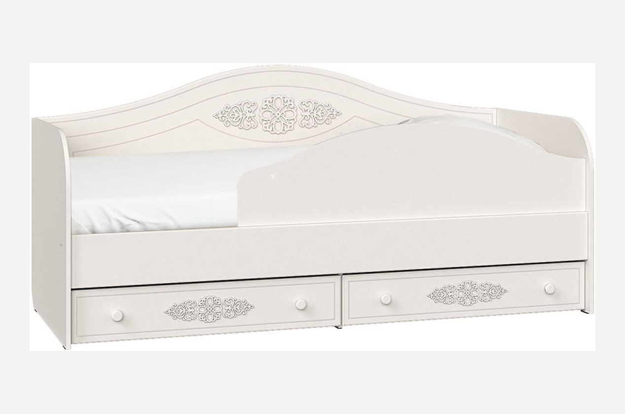 Детская кровать с настилом из мебельных щитов и защитной панелью-бортиком (140х41 см), который устанавливается к любой боковой стенке. В комплект к кровати входят два выдвижных ящика (91х75х17 см) на роликах с фасадами из белого МДФ, декорированные резным объемным узором. Все ящики снабжены телескопическими направляющими полного выдвижения и крепятся ко дну короба. На цоколь устанавливается подпятник.