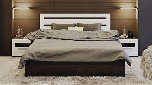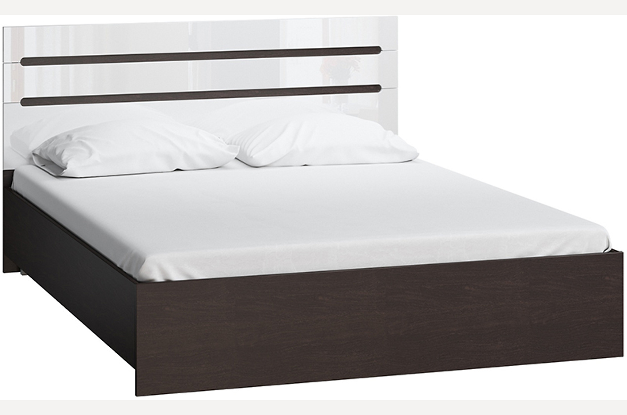 Кровать строгой формы подойдет для спальни в стиле минимализм, где главным критерием является графичность. Основание и декоративные вставки цвета венге в сочетании с белоснежным глянцевым изголовьем создают изысканный и эффектный ансамбль.