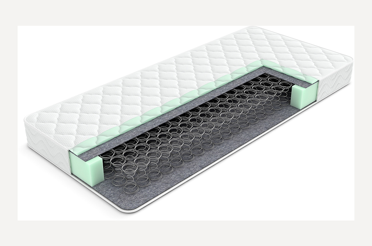 Матрас на основе классического пружинного блока, рельефная поверхность которого создает массажный эффект и позволяет максимально расслабится. Пружинный блок под названием Боннель усилен по периметру ППУ коробом. Термовойлок, который используется в качестве защитного материала, усиливает прочность матраса и позволяет равномерно распределять нагрузку.