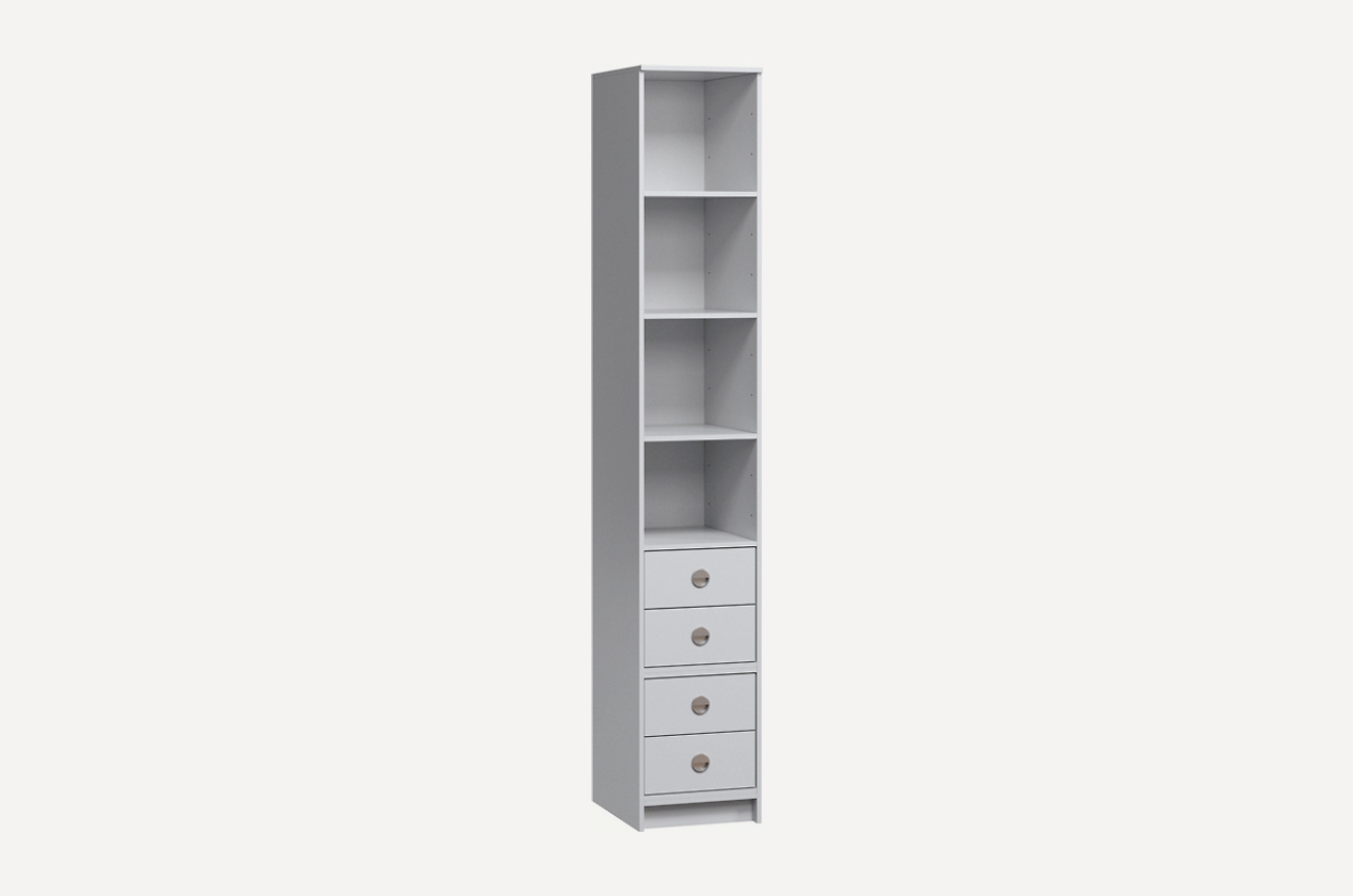 Наполнение универсального модуля «Дели-4» – это комбинация полок и выдвижных ящиков. На стационарных поверхностях удобно хранить одежду в сложенном виде. Отсеки на роликовых направляющих предназначены для аксессуаров, белья и мелких вещей. Модуль изготовлен из ламинированной ДСП 16 мм, задняя стенка – ДВП нейтрального оттенка.