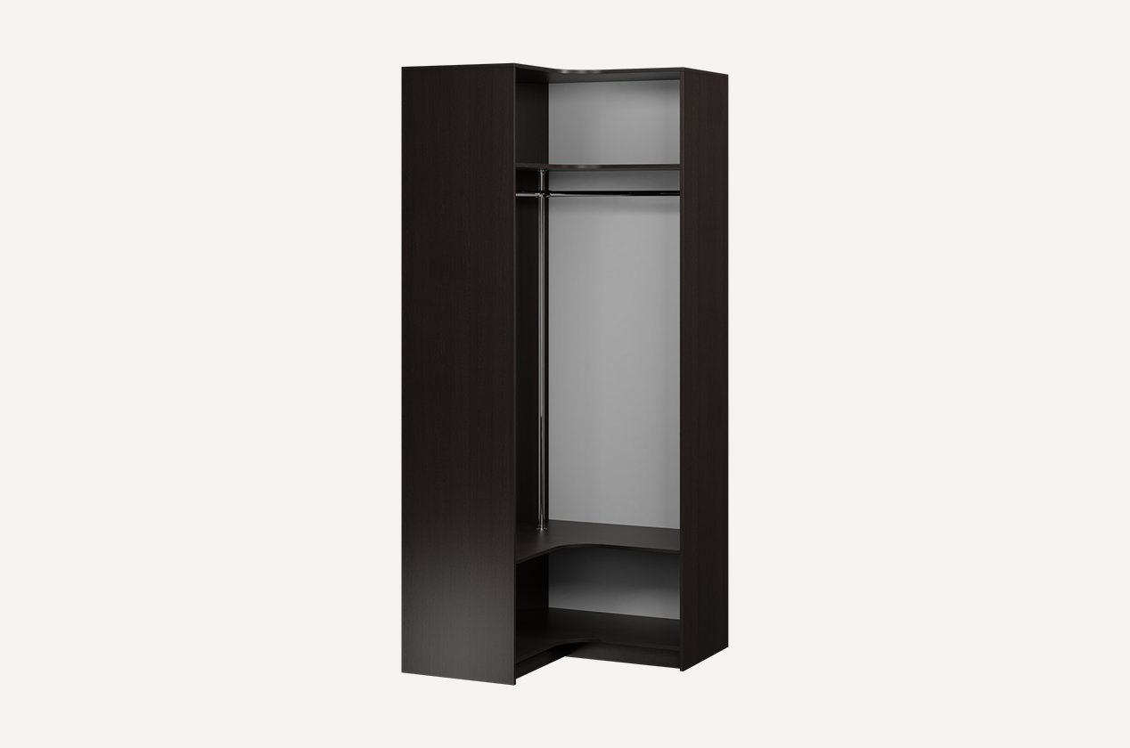 Универсальный модуль «Дели-7» пригодится при проектировании угловой или П-образной гардеробной. В основной части конструкции находятся две штанги для вешалок с одеждой. Сверху – антресоль, внизу – полка под обувь. Модуль изготовлен из ламинированной ДСП 16 мм, задняя стенка – ДВП нейтрального оттенка. Габаритная длина левого и правого отделений по задней стенке имеет одинаковое значение и равна 90 см. Ширина модуля 50 см, высота 240 см.