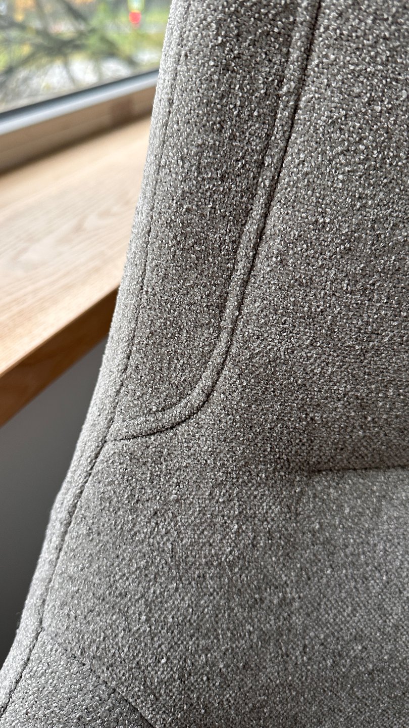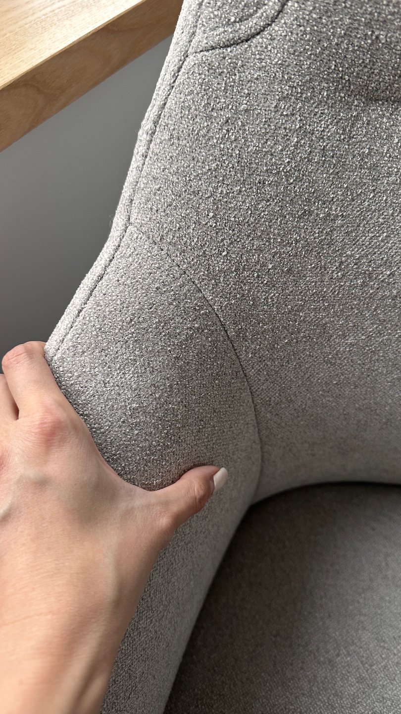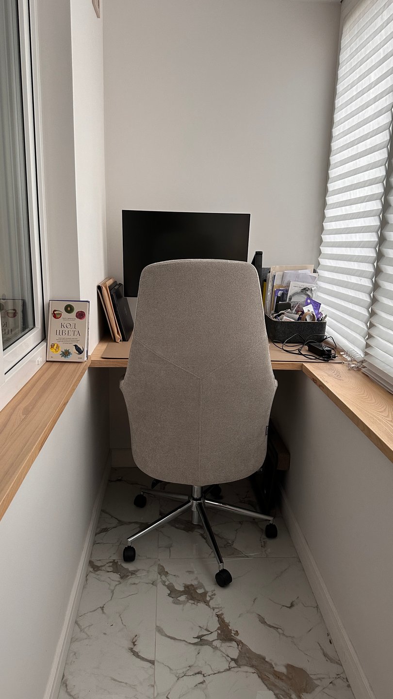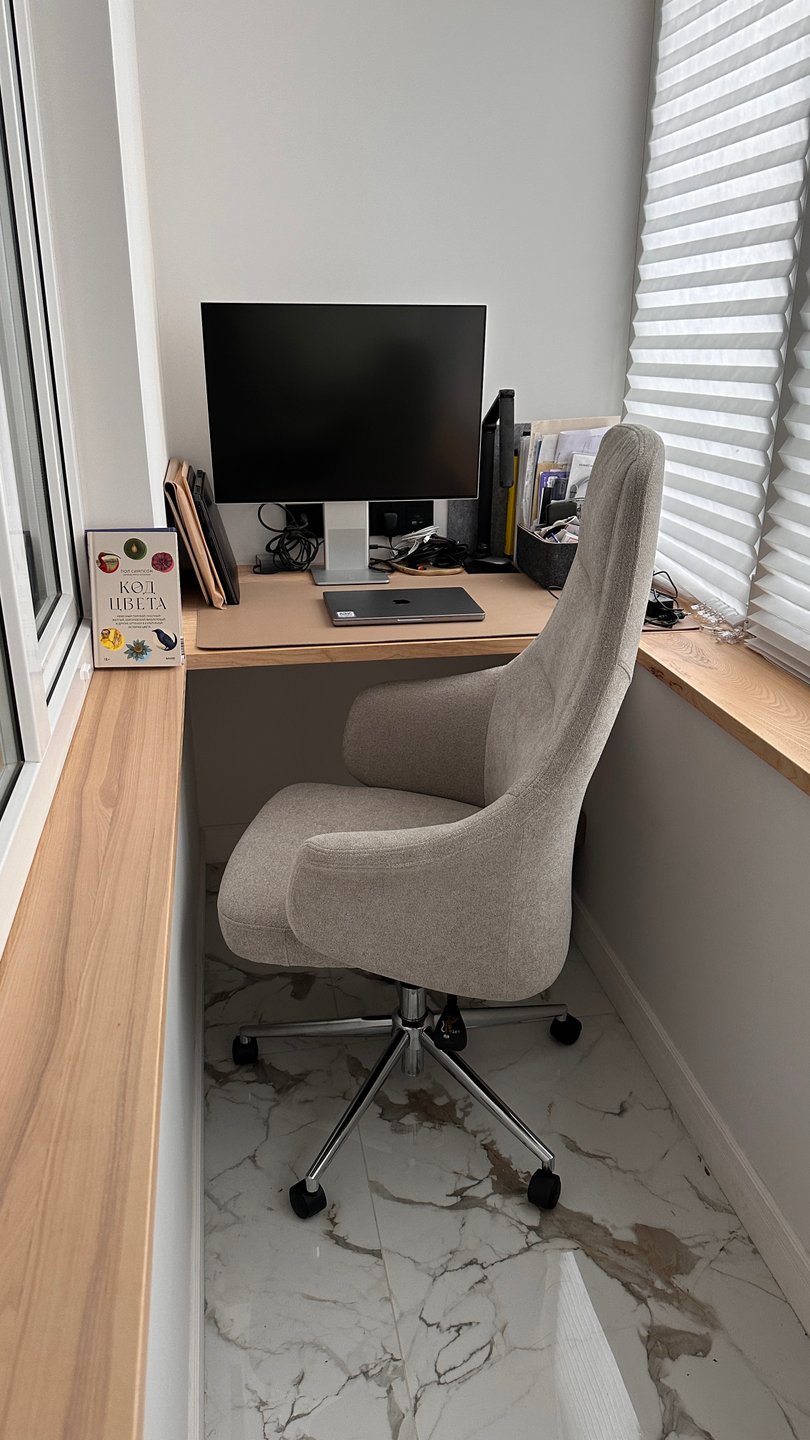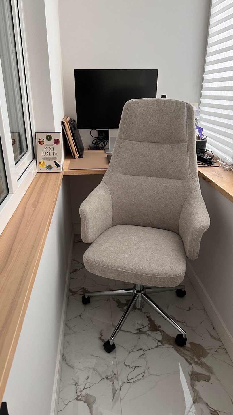 Боялась заказывать без отзывов... НО! Кресло на удивление классное, мягкое и уютное, держит поясницу неплохо, подголовник мягкий, можно откинуть голову и дать шее отдохнуть, если долго работаете за компом. Ткань мягкая, тактильно приятная, такое милое микро букле. Оттенок теплый серый. Не беж, как на сайте, серый все же, чуть темнее чем на сайте, но очень удачный тон, подойдет в любой интерьер. Реальный оттенок на фотографии обивки, где моя рука.