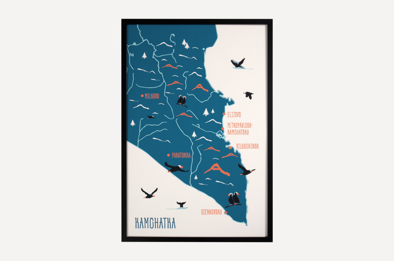 Серия постеров Камчатка - яркое и акцентное решение для интерьера. Стильные авторские рисунки освежат интерьер и добавят уникальности. Композиция состоит из пяти постеров, которые можно собирать и миксовать друг с другом, создавая разное настроение.