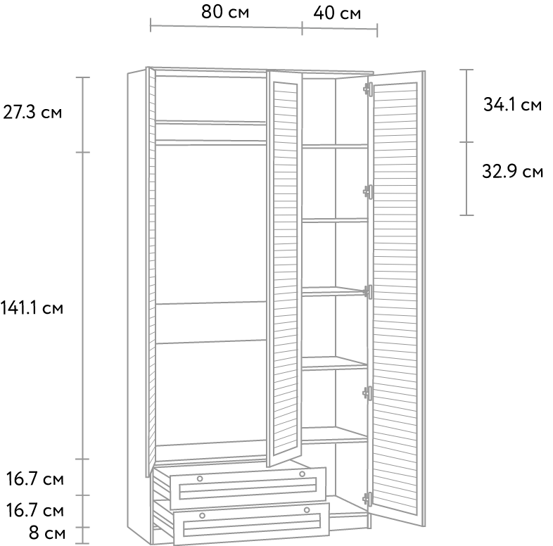 Распашной шкаф – классическое решение для хранения одежды и личных вещей. Надежность и простота конструкции гарантируют долгий срок службы, а грамотное внутреннее наполнение – вместительность и легкий доступ к содержимому. Современный дизайн корпуса и фасадов позволят легко разместить модель в интерьере любой комнаты: гостиной, спальни, прихожей и даже офиса.