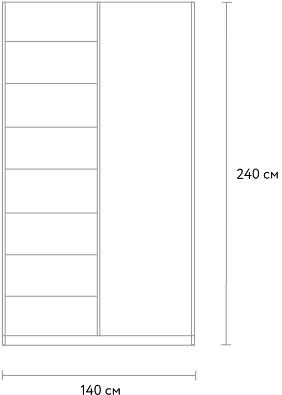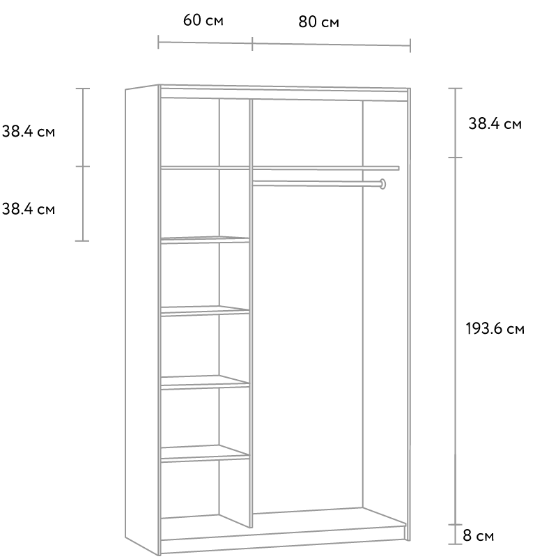 Дверцы навешены с наружной стороны, что позволяет расширить внутреннее пространство шкафа. Вместительные полки для обуви, одежды и аксессуаров делят шкаф на удобные секции. Штанга для вешалок комфортно расположена на уровне глаз.