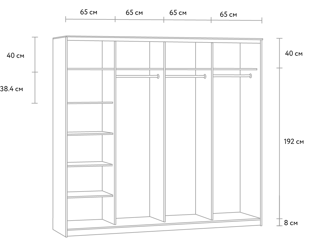 Раздвижные дверцы шкафа-купе скрывают за собой внутреннее наполнение комбинированного типа. Полки – для хранения постельных принадлежностей и белья в сложенном виде. Штанга – для размещения одежды на вешалках и плечиках.