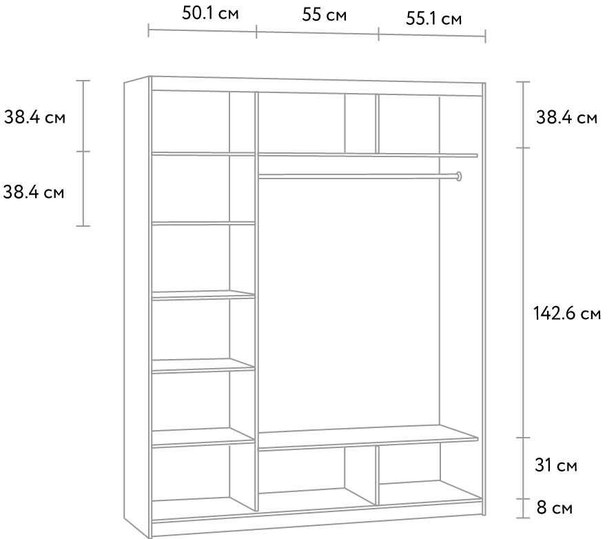 габаритная глубина шкафа больше внутренней глубины на 7 см за счет внешней навески дверей. Лента-щетка входит в комплект. Во избежание падения изделия, рекомендуется прикрепить его к стене с помощью мебельного навеса, который присутствует в комплекте. Все стены изготовлены из разных материалов, поэтому крепежные средства не прилагаются. Для подбора подходящего крепежа рекомендуем обратится в специализированный магазин.