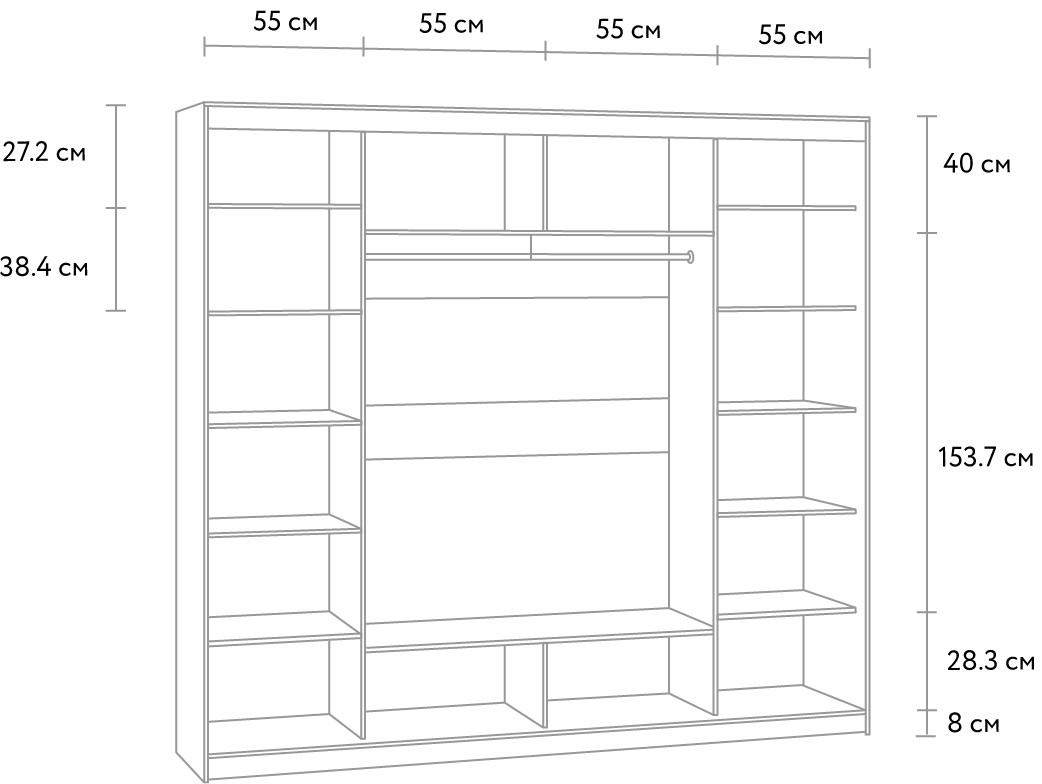 Четырехдверный шкаф «Тебар» – удобная система для упорядоченного хранения одежды. Благодаря солидным габаритам и повышенной вместимости, он без труда вместит гардероб большой семьи. В конструкции шкафа предусмотрены полки и штанги, а фасад украшает большое зеркало, в котором можно рассмотреть себя в полный рост. За дверцами вас ждет продуманное внутреннее наполнение. А наличие ленты-щетки предотвратит попадание пыли внутрь шкафа и обеспечит бесшумное открывание и закрывание створок (данный элемент в базовую комплектацию изделия не входит и приобретается отдельно).
