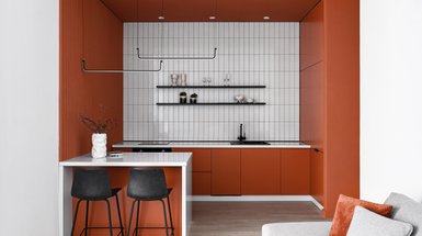 - Вписать в интерьер яркий кухонный гарнитур, который хозяева заказали заранее.