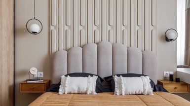 В спальне хотелось создать максимальную камерность и уют — выбор сделали в пользу приглушенных оттенков. Стену за изголовьем частично нарастили с помощью листа гипсокартона и оформили обоями с эффектом штукатурки. Уютные круглые бра в виде луны и светильника-обруча освещают изголовье мягким приглушенным светом (ценно, если посреди ночи придется вставать к дочери).