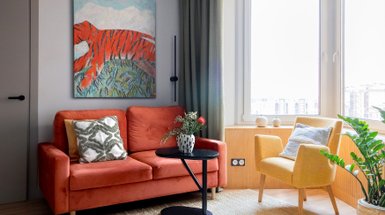 Основная идея этого интерьера строилась вокруг создания чего-то нетривиального и уютного в типичном спальном районе. При этом важно было не выйти за рамки бюджета. Сделать квартиру нешаблонной помог индивидуальный и долгий подбор цветов, использование приема color blocking, а также микс фактур и разного текстиля.