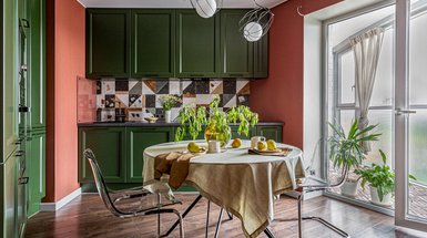 Яркий кухонный гарнитур хозяева квартиры заказали еще до начала сотрудничества с дизайнером, он просто ждал своего часа. Чтобы вписать его в общую концепцию, было принято решение раскрасить стены в кухне-гостиной в поддержку ярко-зеленых фасадов — многоцветность и графика легко подружились.